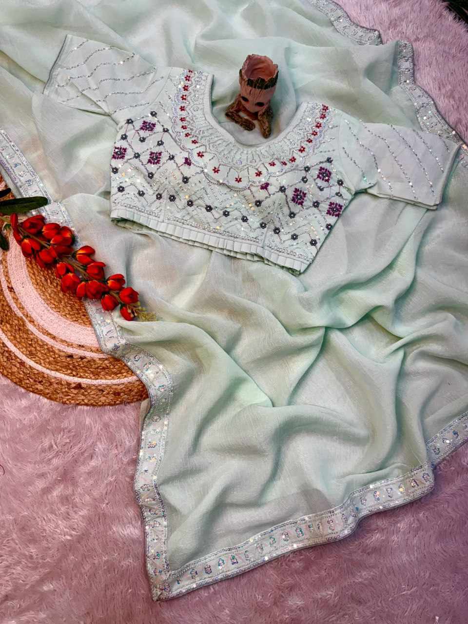 Saree Fabric: Beautiful crush shining saree with beautiful heavy handwork with beautiful rainbow sequins attached VALMOTI lace on the saree.