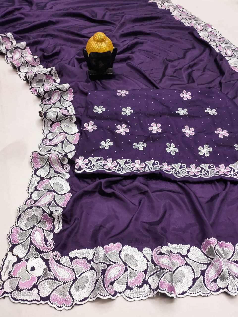 Pure D Natural Soft Satin saree with heavy Embroidery thread and heavy siroski work and cutwork borders